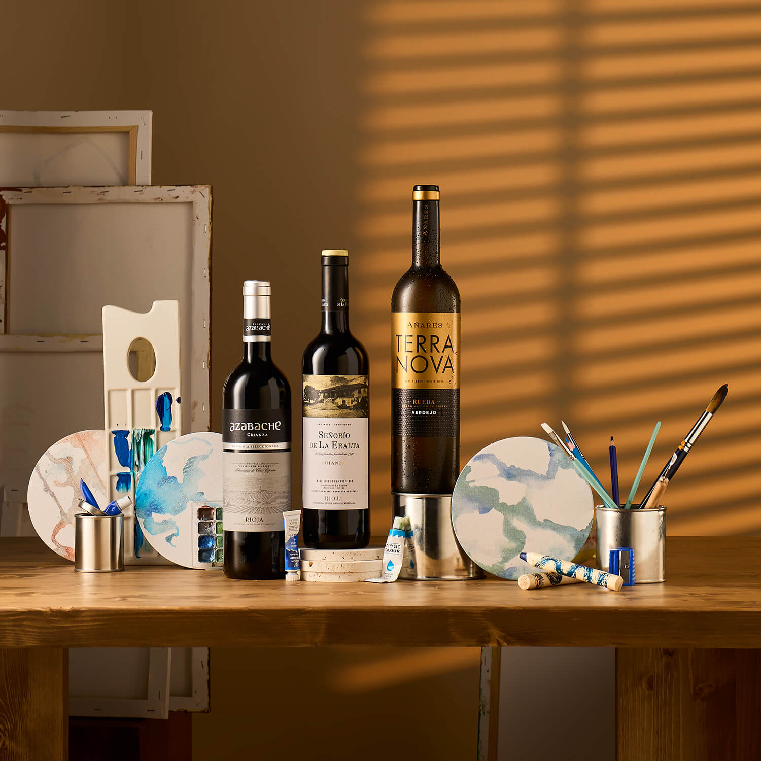 Lote variado con 6 artículos seleccionados de charcutería, vinos, dulces y conservas.