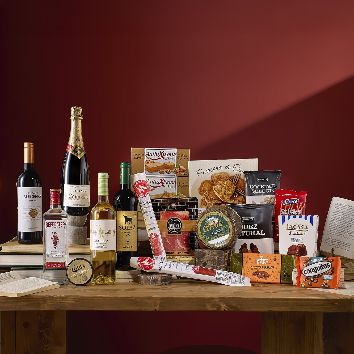 Lote variado con 24 artículos seleccionados de charcutería, vinos, dulces y conservas.