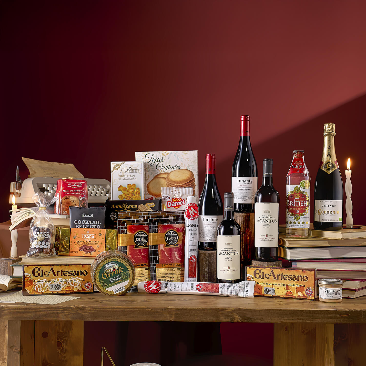 Lote variado con 24 artículos seleccionados de charcutería, vinos, dulces y conservas.