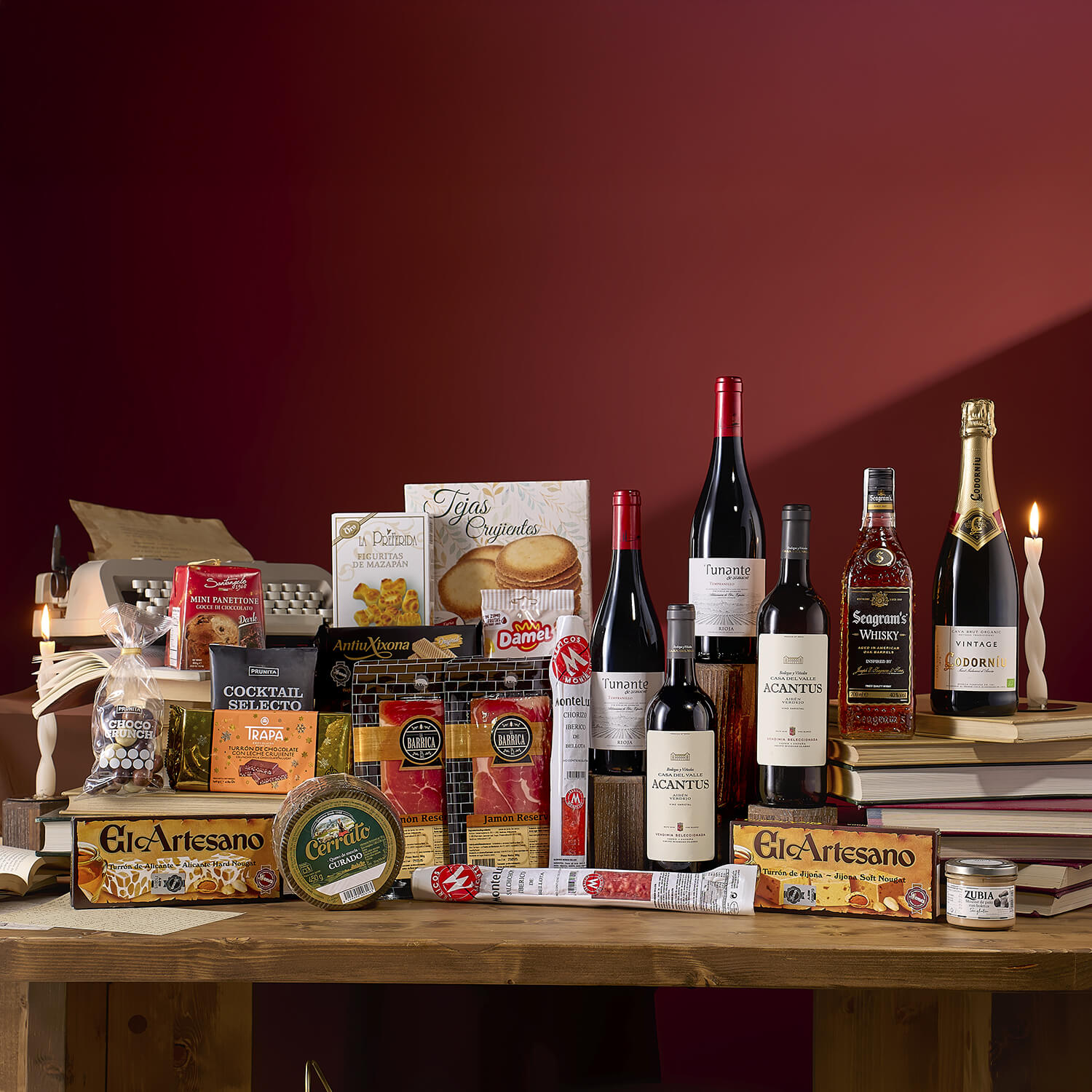 Lote variado con 24 artículos seleccionados de charcutería, vinos, dulces y conservas.