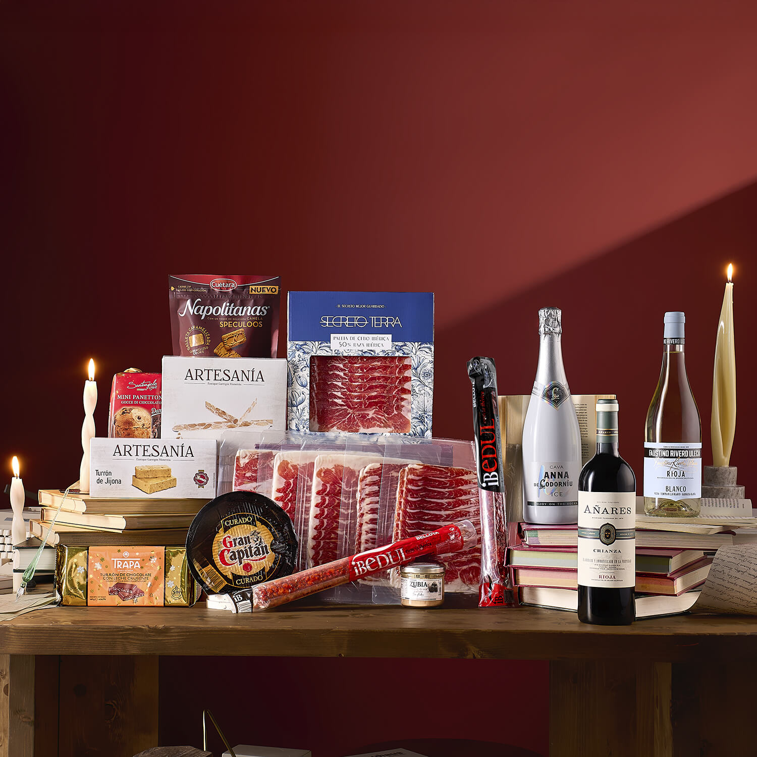 Lote variado con 18 artículos seleccionados de charcutería, vinos, dulces y conservas.