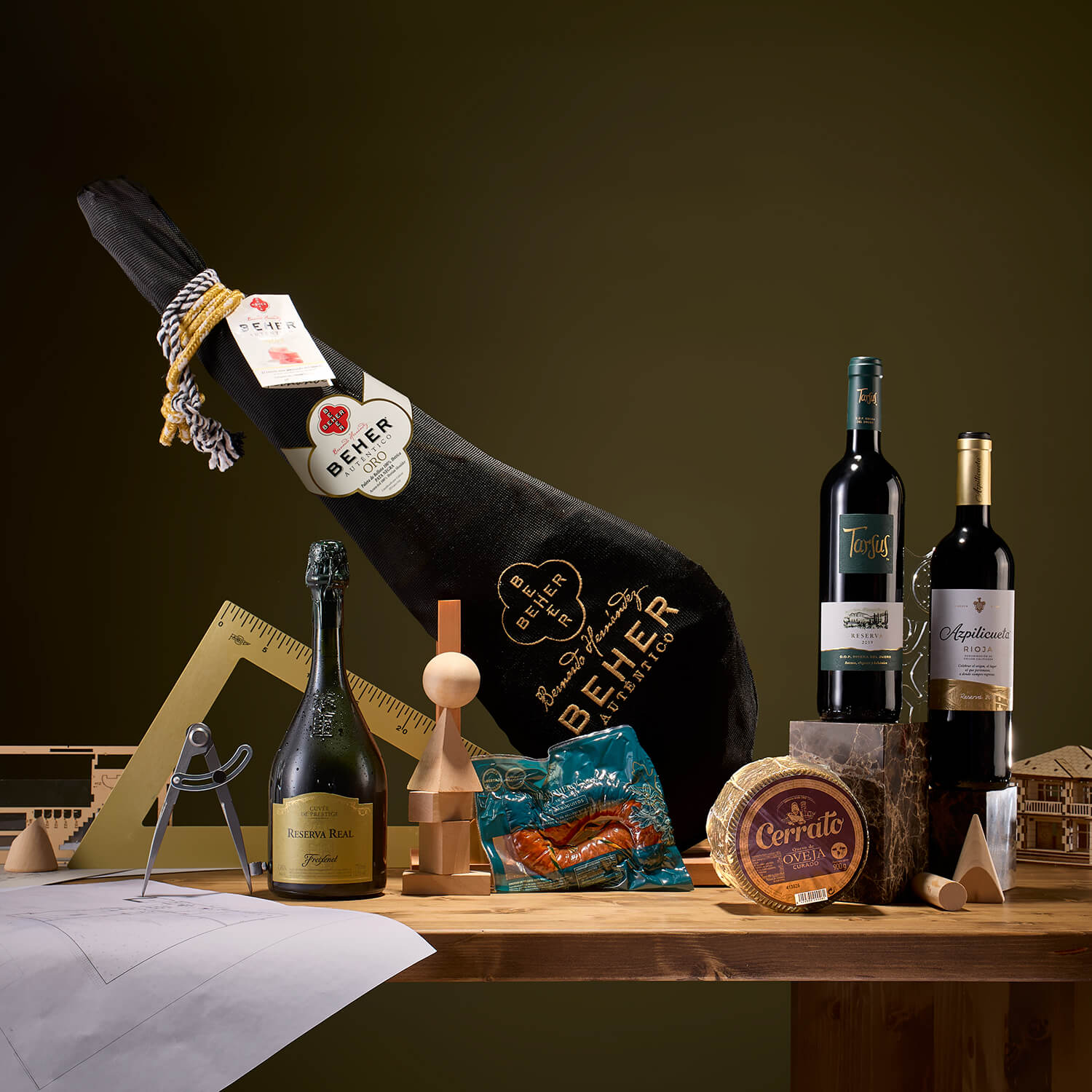 Lote variado con 10 artículos seleccionados de charcutería, vinos, dulces y conservas.