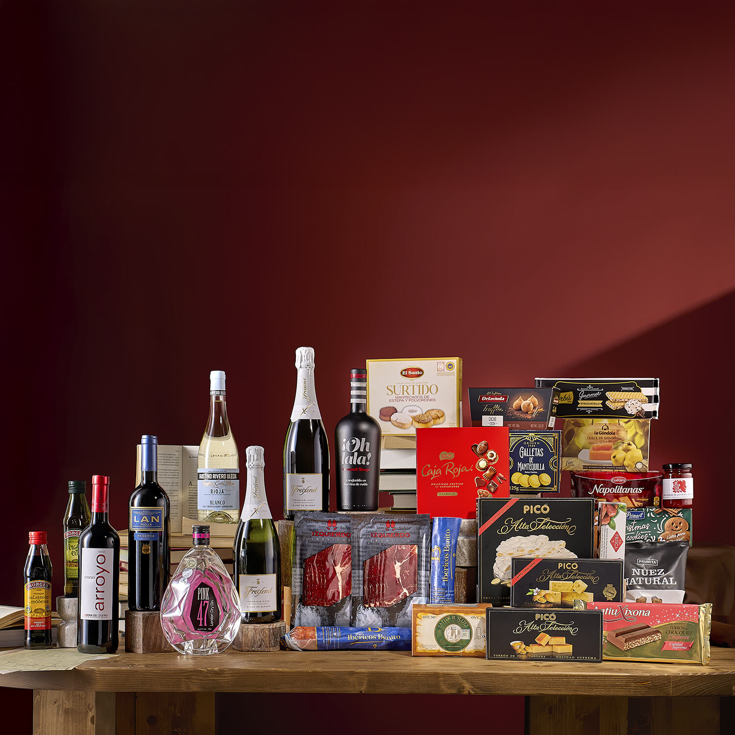 Lote variado con 32 artículos seleccionados de charcutería, vinos, dulces y conservas.