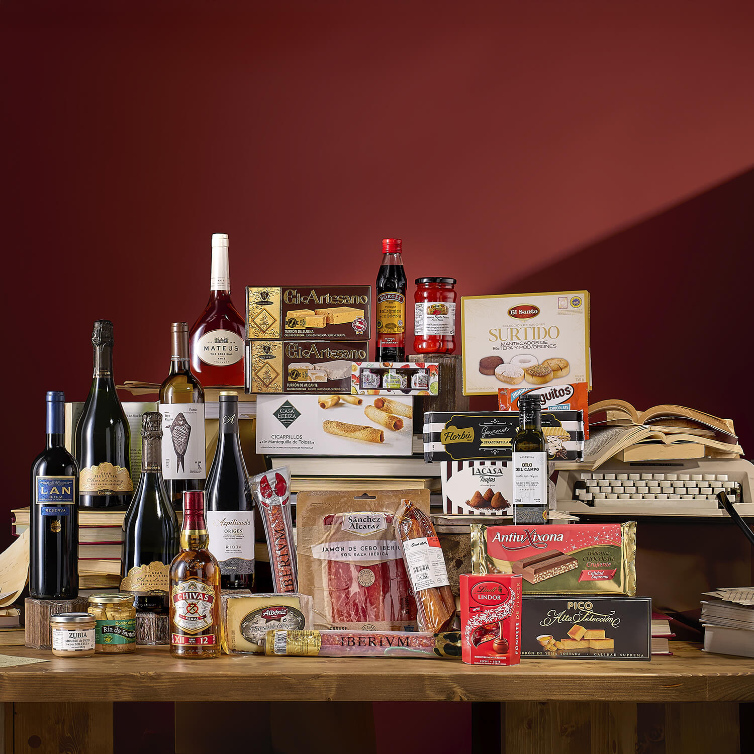 Lote variado con 32 artículos seleccionados de charcutería, vinos, dulces y conservas.