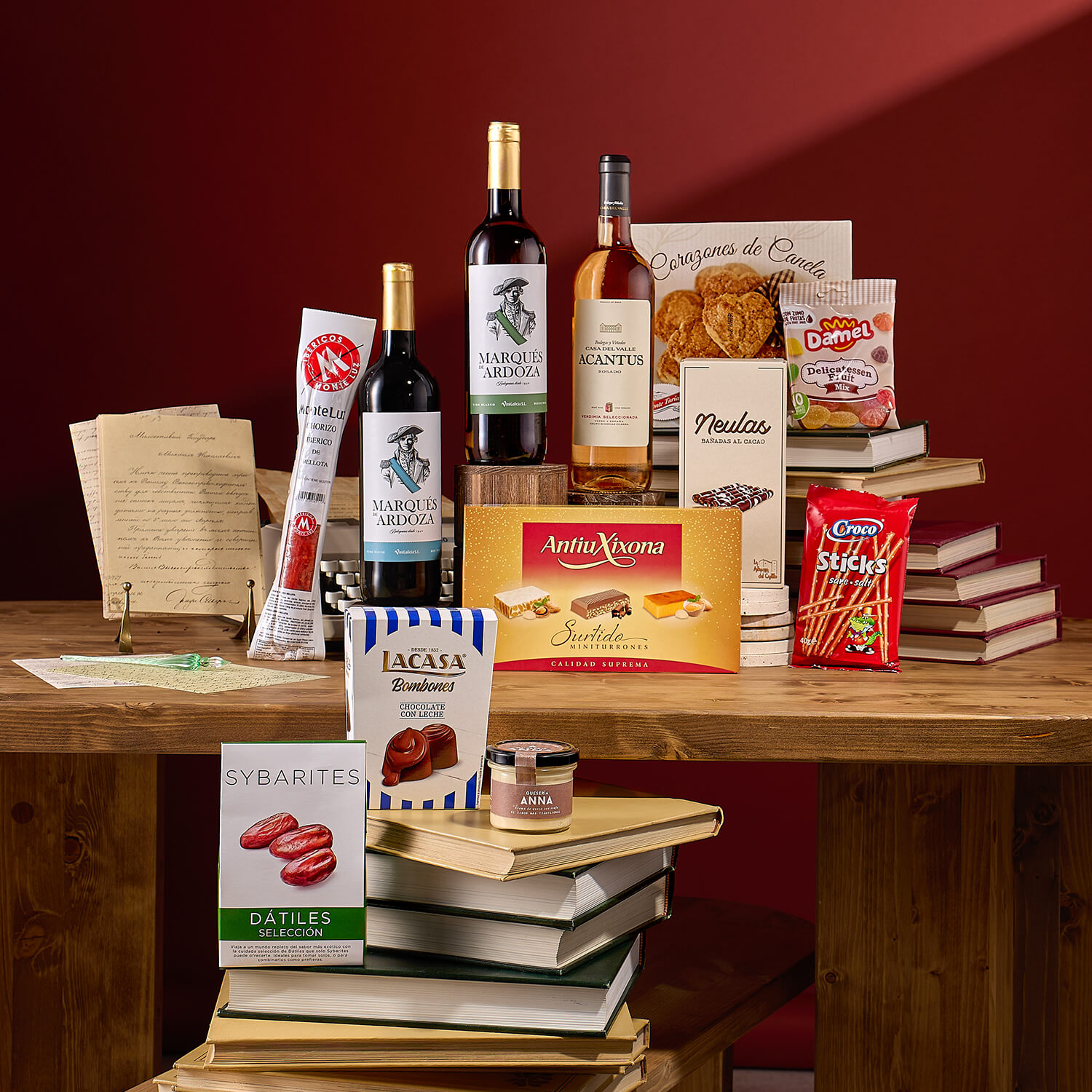 Lote variado con 17 artículos seleccionados de charcutería, vinos, dulces y conservas.