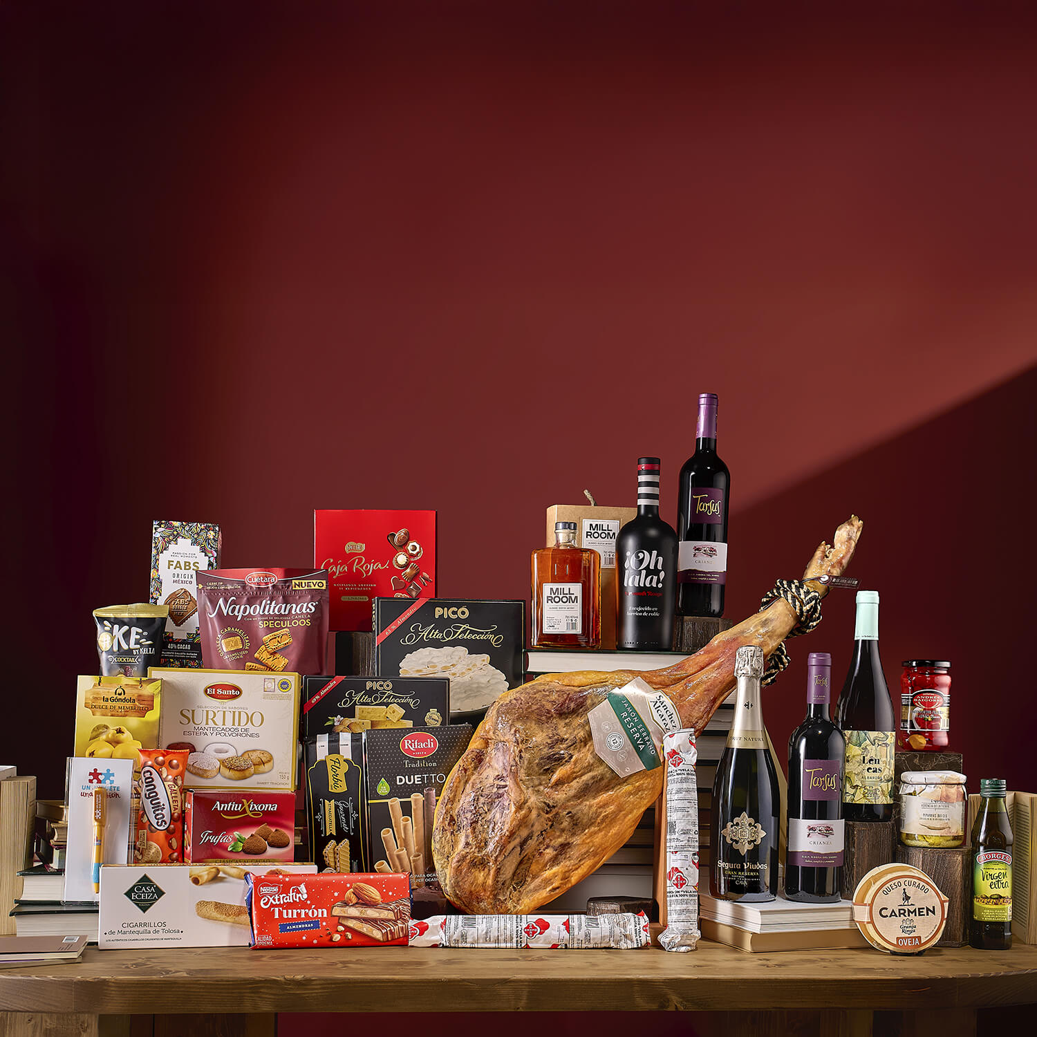 Lote variado con 32 artículos seleccionados de charcutería, vinos, dulces y conservas.