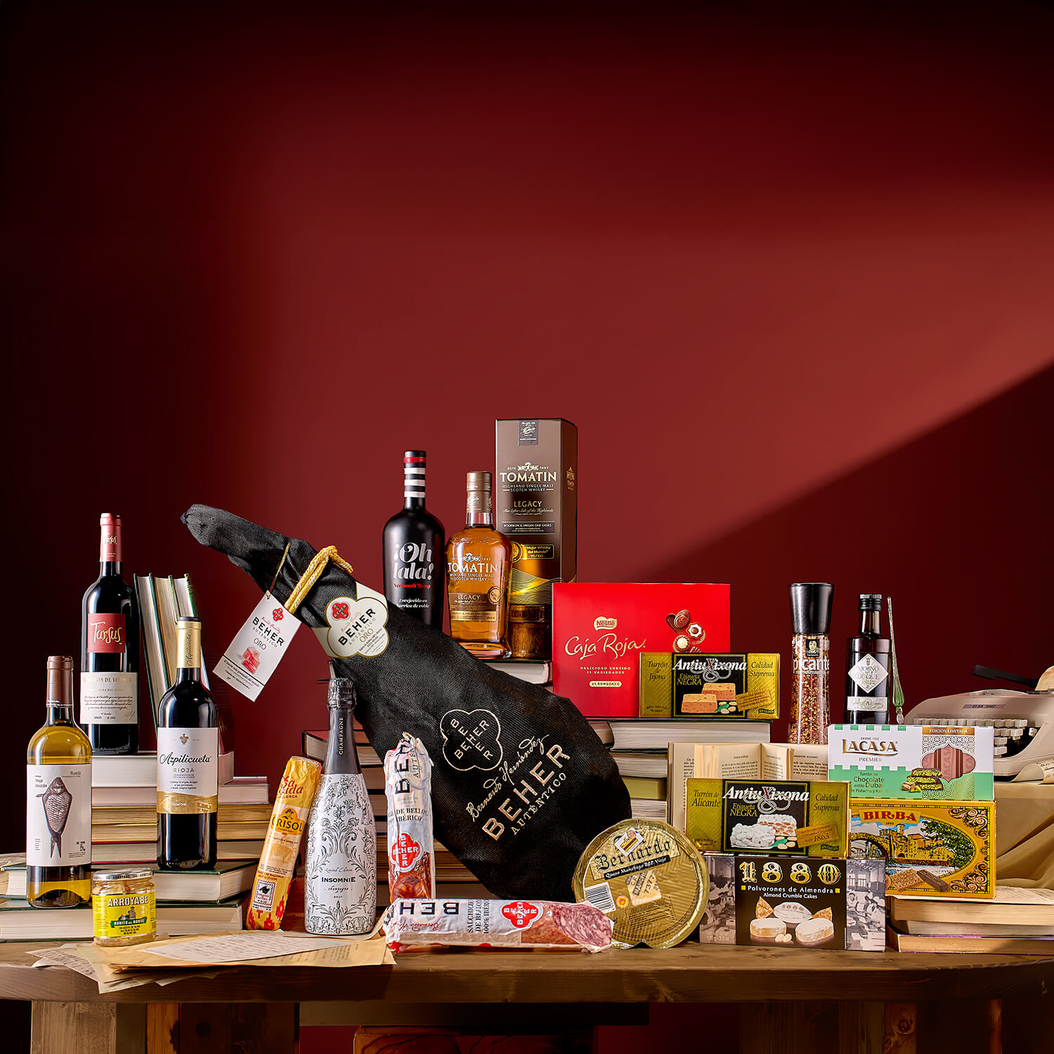 Lote variado con 25 artículos seleccionados de charcutería, vinos, dulces y conservas.