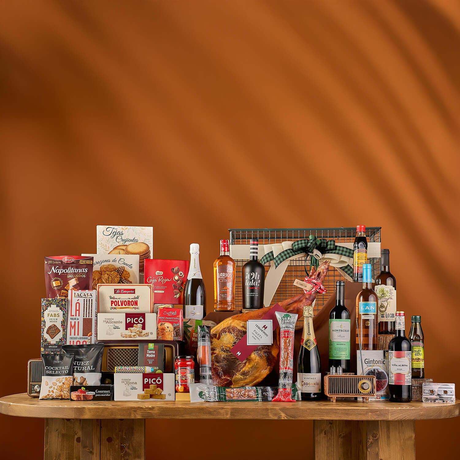 Lote variado con 38 artículos seleccionados de charcutería, vinos, dulces y conservas.