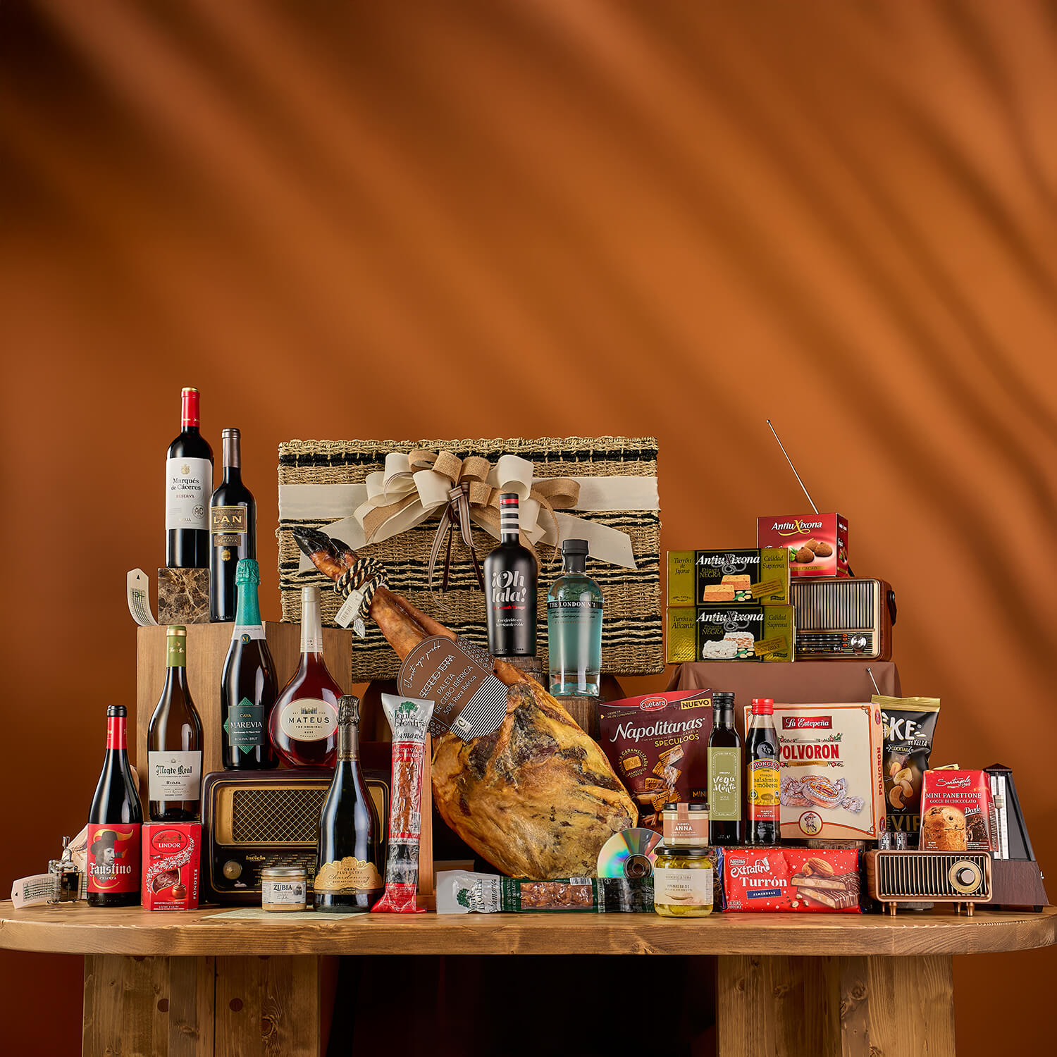 Lote variado con 32 artículos seleccionados de charcutería, vinos, dulces y conservas.