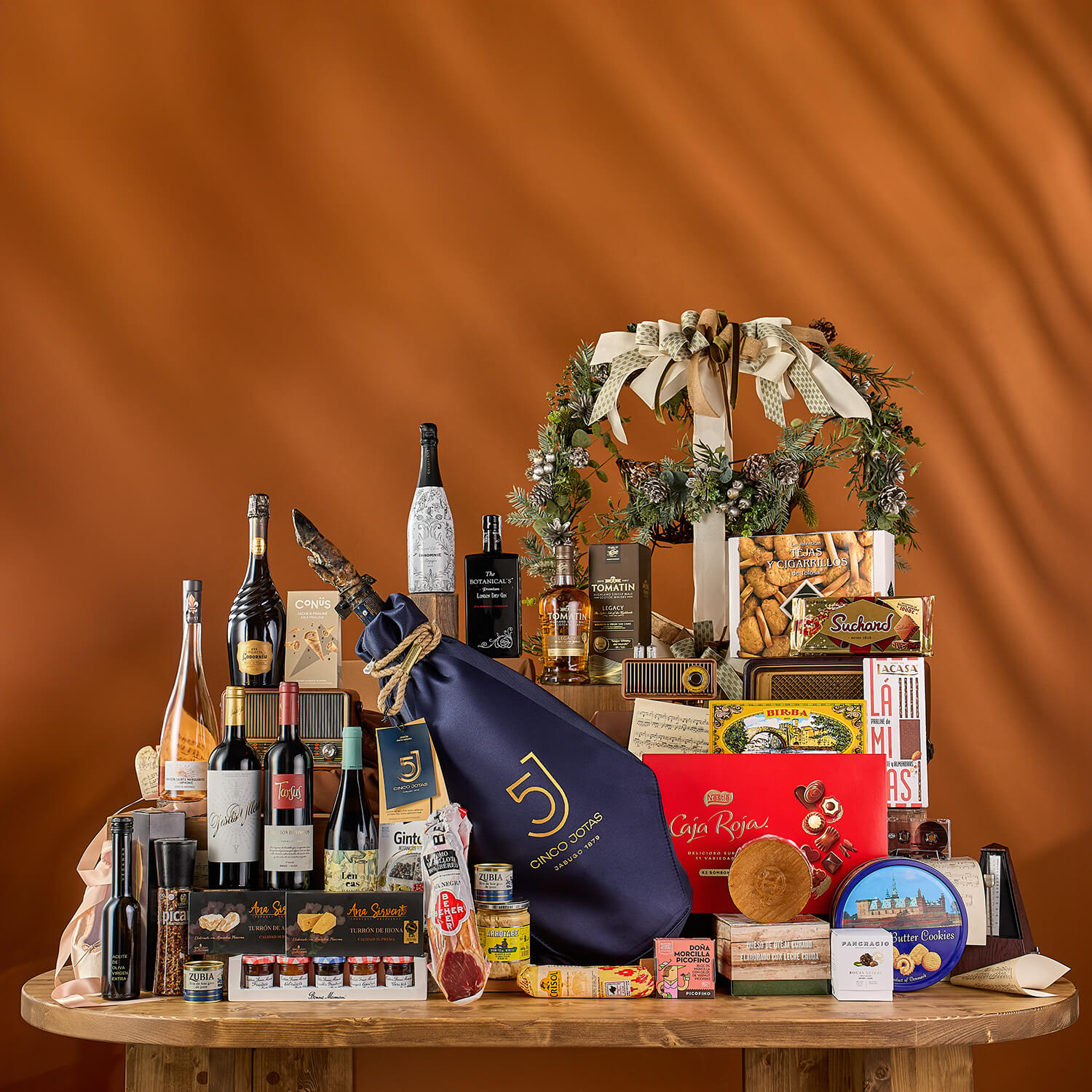 Lote variado con 35 artículos seleccionados de charcutería, vinos, dulces y conservas.