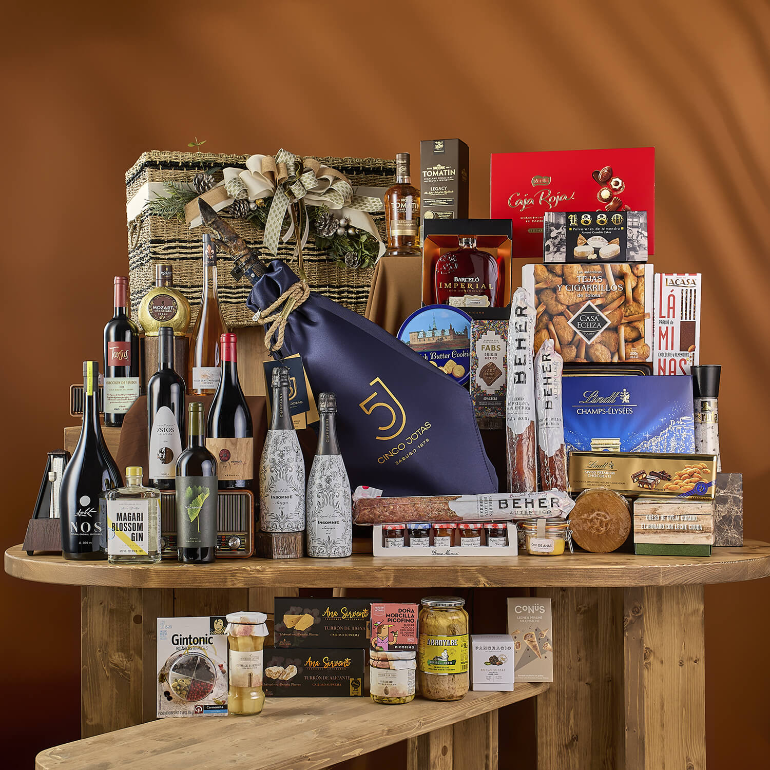 Lote variado con 42 artículos seleccionados de charcutería, vinos, dulces y conservas.