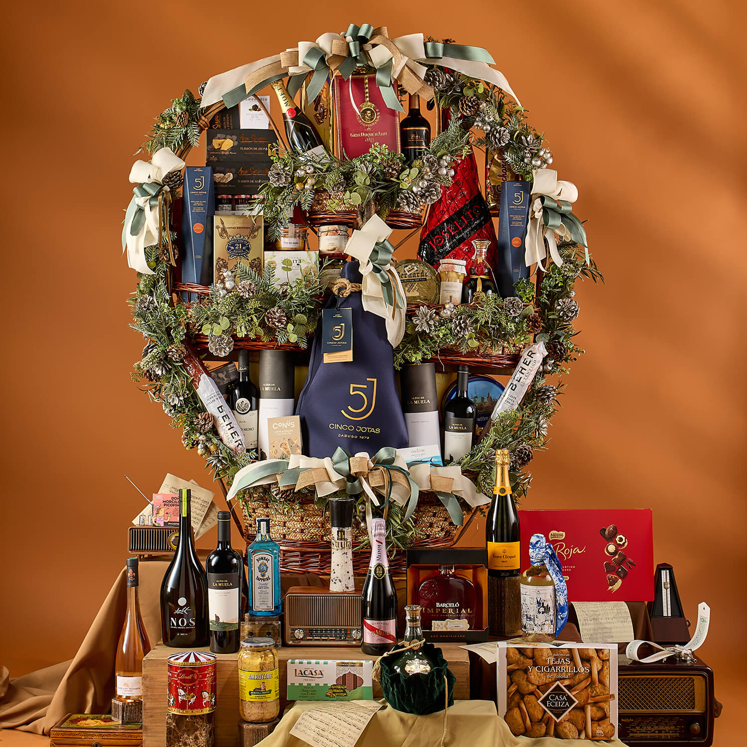 Lote variado con 48 artículos seleccionados de charcutería, vinos, dulces y conservas.