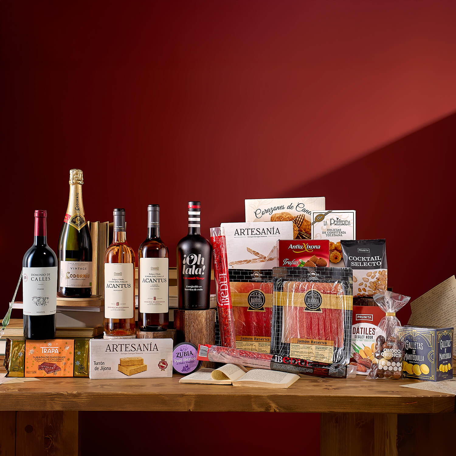 Lote variado con 24 artículos seleccionados de charcutería, vinos, dulces y conservas.
