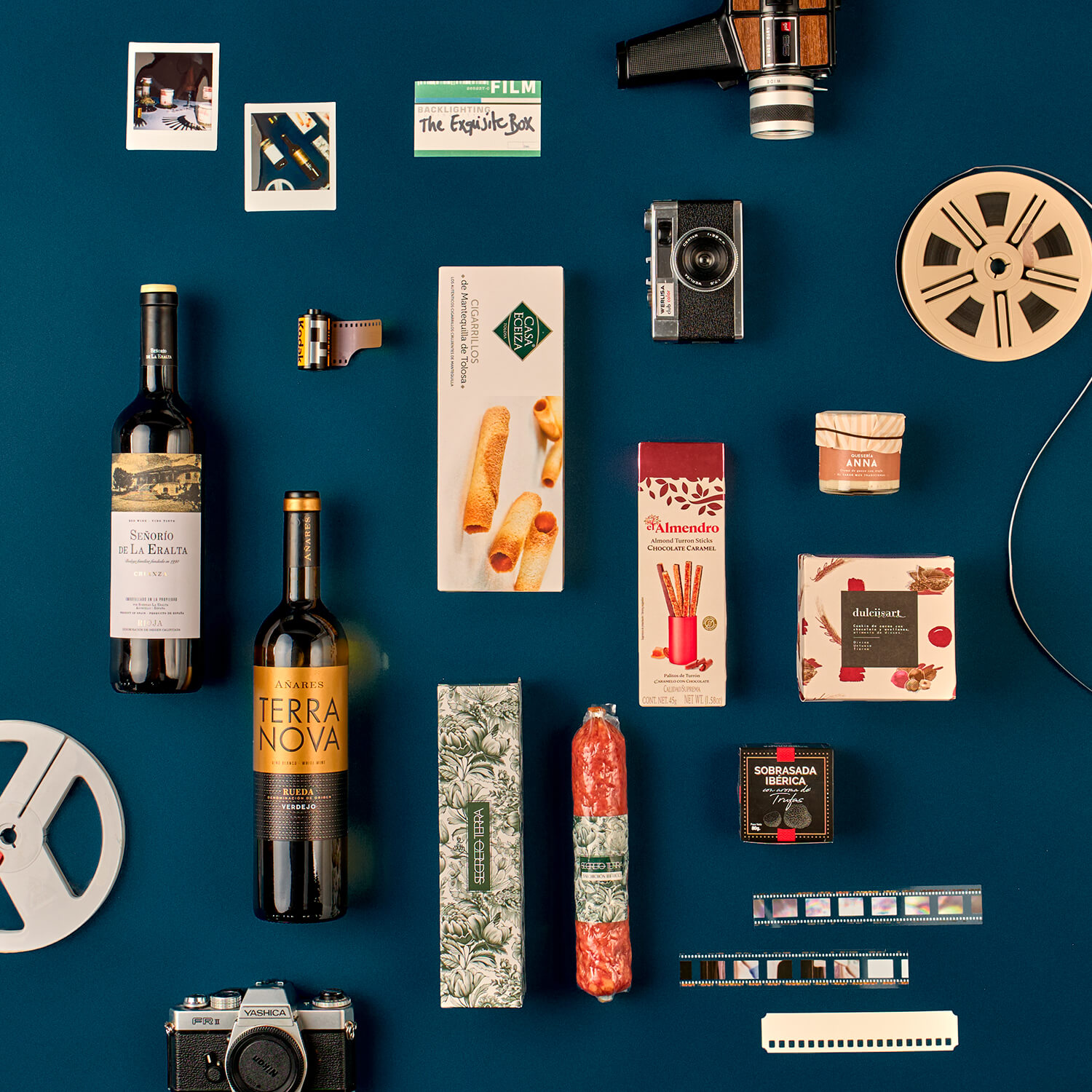 Lote variado con 13 artículos seleccionados de charcutería, vinos, dulces y conservas.
