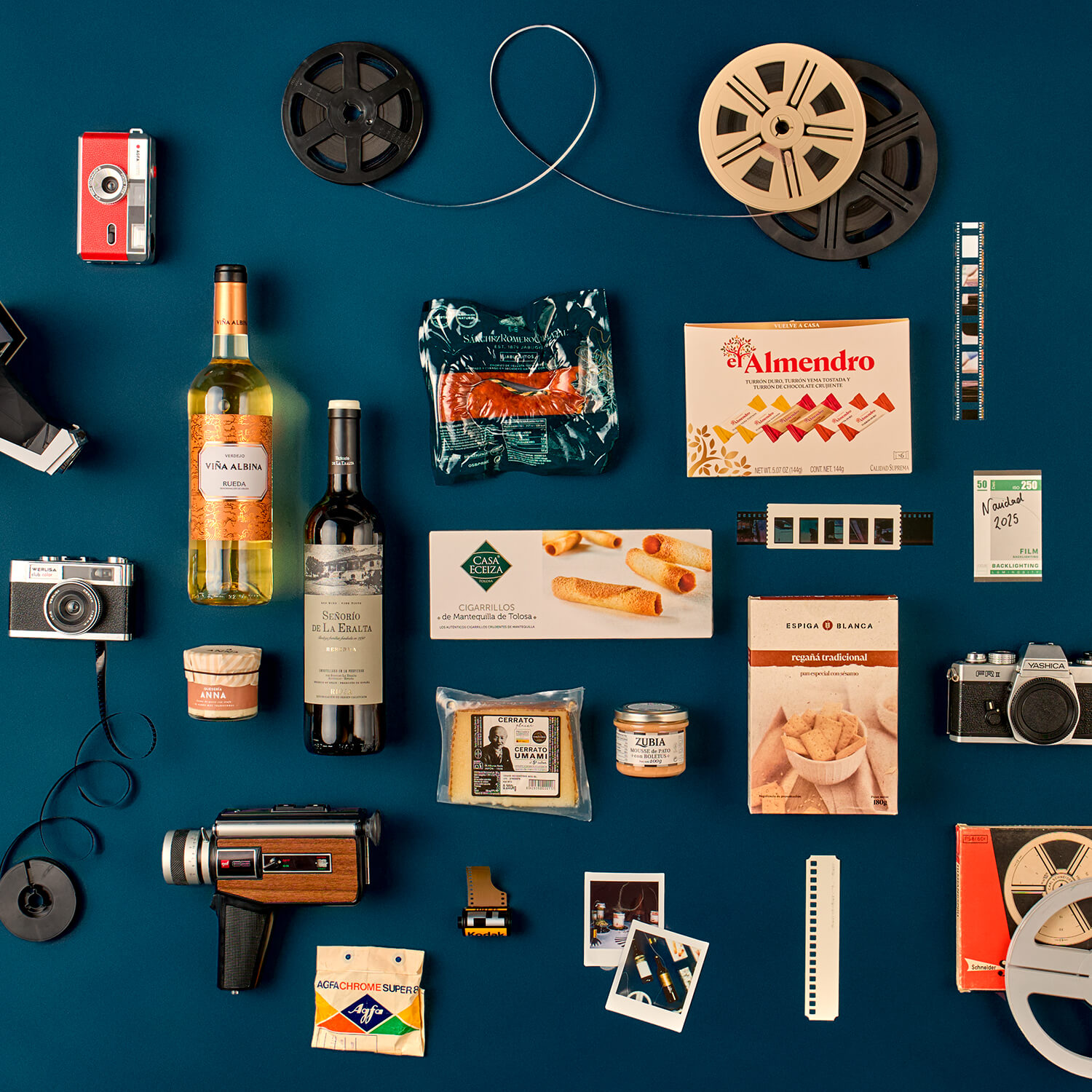 Lote variado con 15 artículos seleccionados de charcutería, vinos, dulces y conservas.