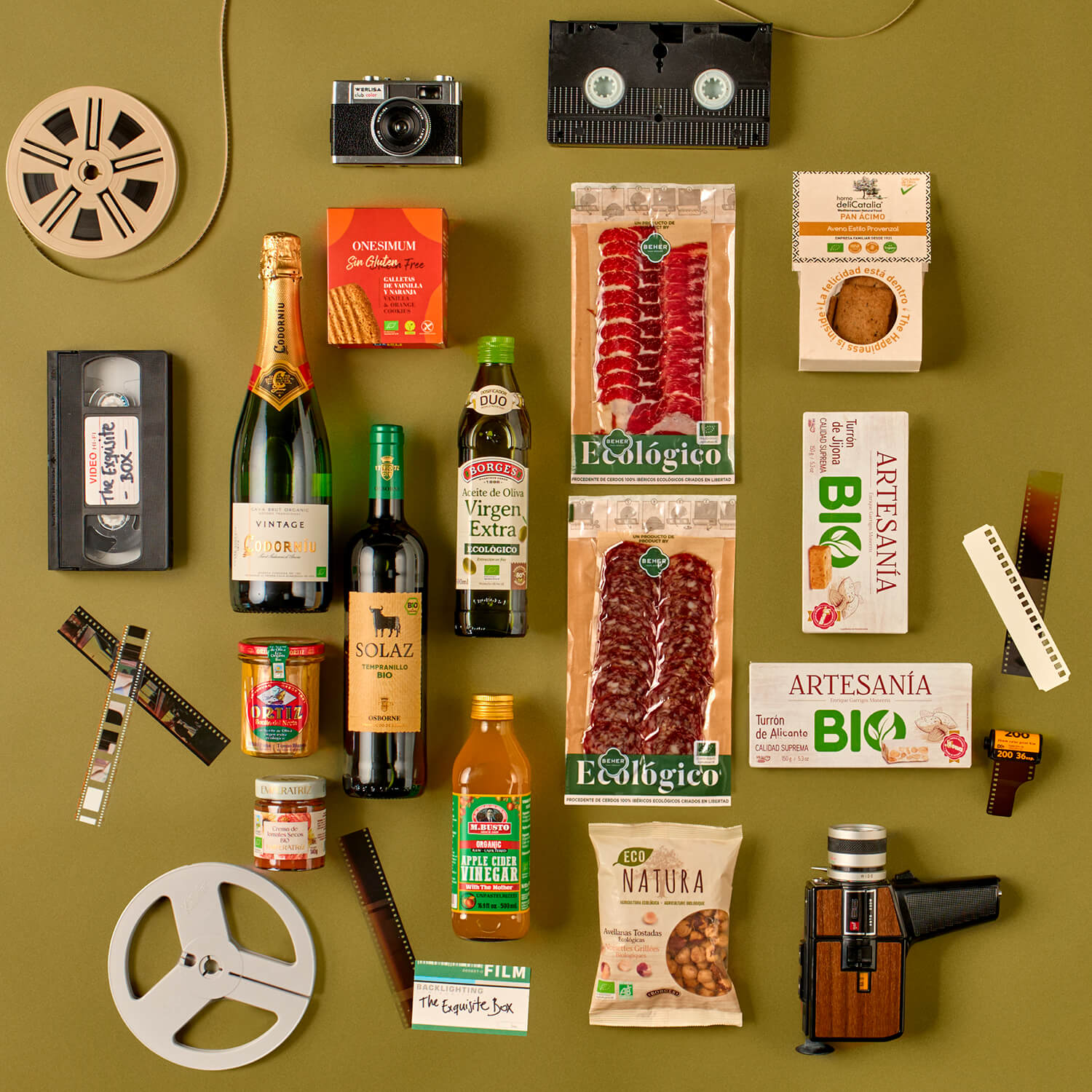 Lote variado con 18 artículos seleccionados de charcutería, vinos, dulces y conservas.