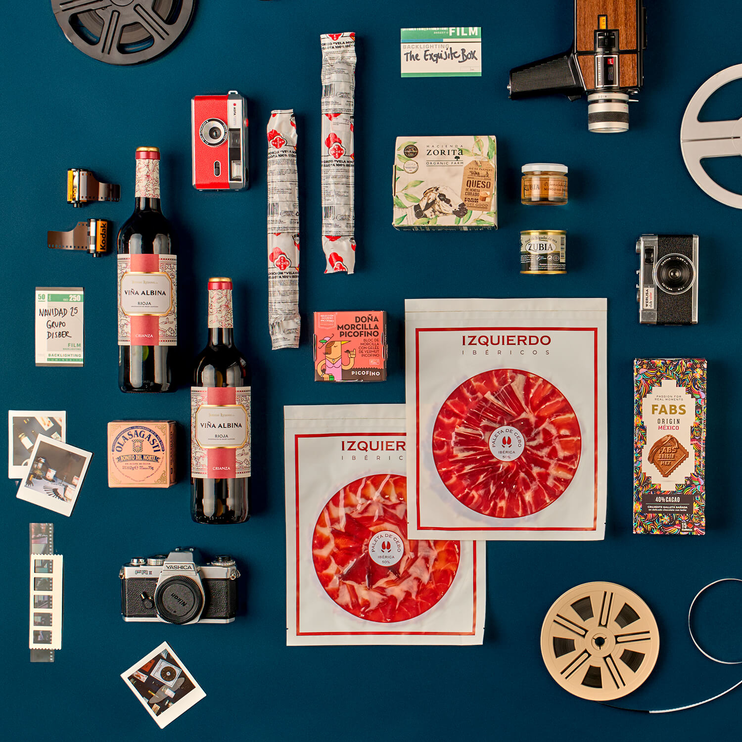 Lote variado con 16 artículos seleccionados de charcutería, vinos, dulces y conservas.
