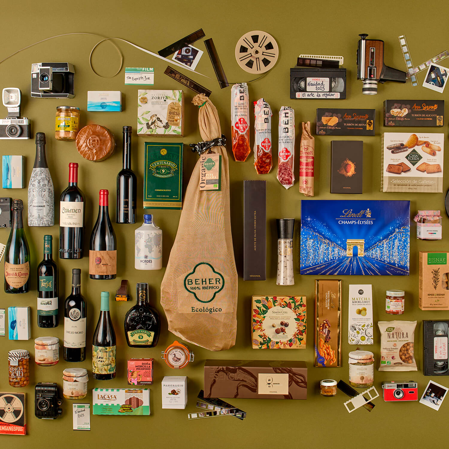 Lote variado con 48 artículos seleccionados de charcutería, vinos, dulces y conservas.