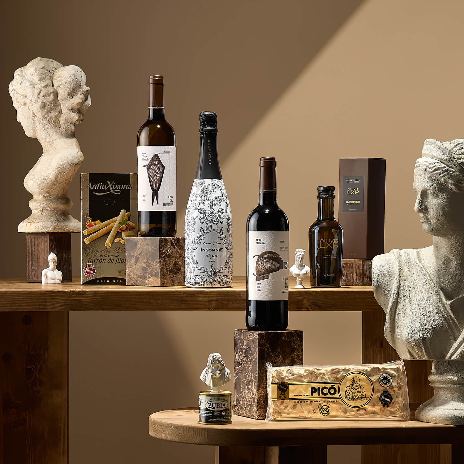 Lote variado con 12 artículos seleccionados de charcutería, vinos, dulces y conservas.